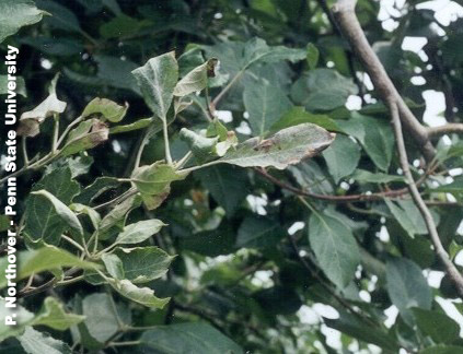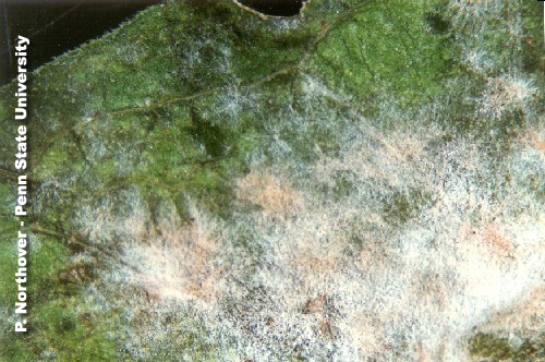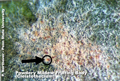Powdery mildews are one of the easier diseases to recognize. They differ from other fungi as most of the fungus is outside of the plant as opposed to inside the host plant. As the name suggests, the masses of fungal spores (conidia) responsible for these diseases, give the plant the appearance of being coated with flour or talcum powder (See Figure 1). Areas of white to grayish growth (mycelium) can appear on young plant tissues (leaves, stem, and fruit), and can become severe enough that the entire surface is covered. As the mycelium ages, the mildew may take on a light reddish brown to gray appearance, the result of the production of fruiting structures (cleistothecia) (See Figure 2).