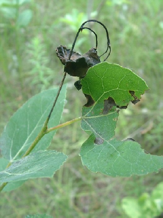 The death of the leaf tips results in distortion of the leaves, but generally the leaf bases and petioles stay alive when V. populi is the pathogen. V. moreletii can infect petioles, turning them black.