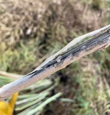 Early signs of striping should bring you back to the field to take samples at swathing or post-harvest. Walk fields when the stems begin to dry and peel. Pull suspect stems and check for peeling skin with black specks and cut at the base to see if there are grey cross‑sections. If identification is uncertain, submit samples to an accredited lab for V. longisporum testing.