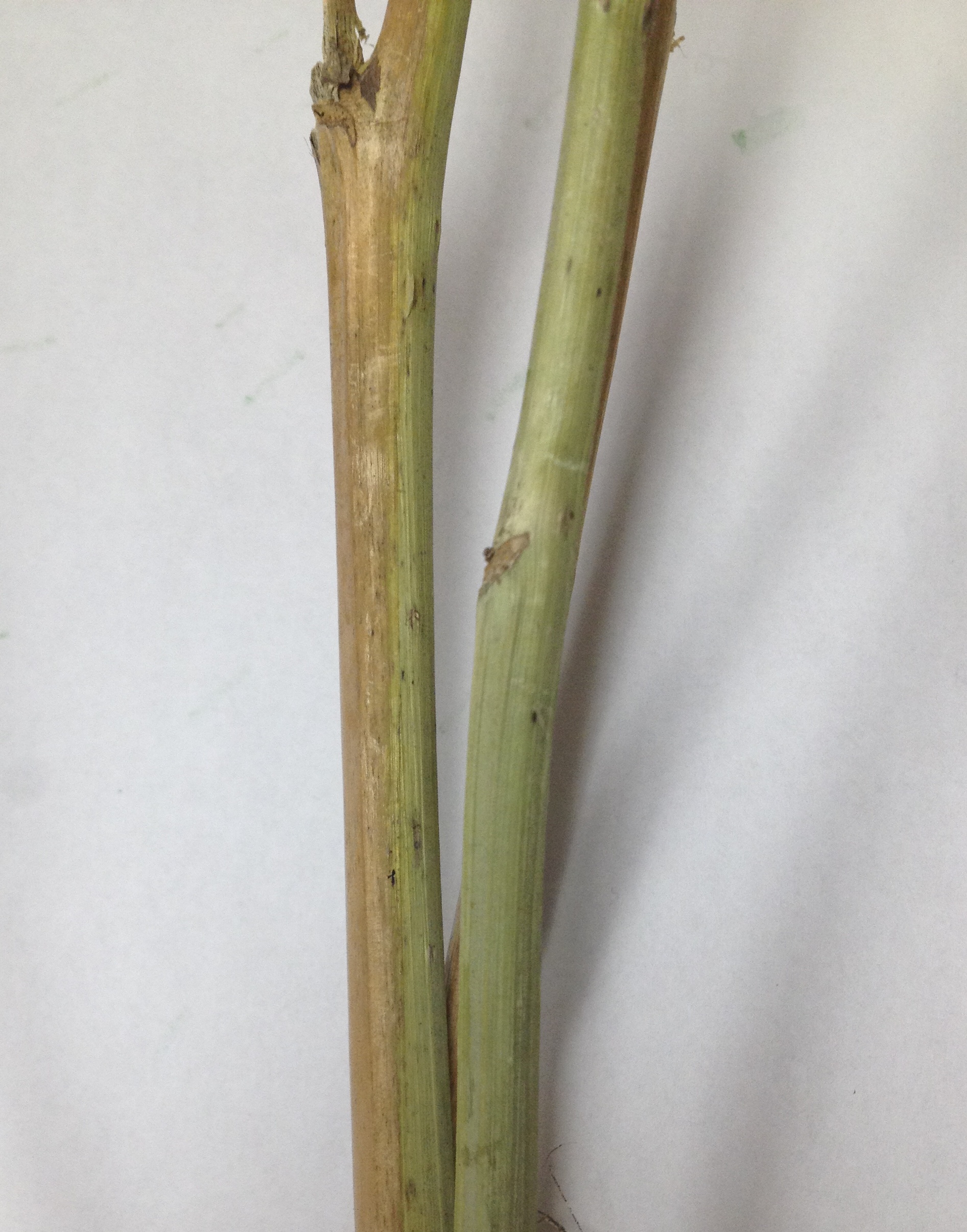 As the plant fully ripens, the outer layer of the stem epidermis peels back to reveal black microsclerotia just below the surface.