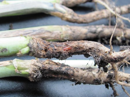 Blackleg infected canola roots and basal stems, also showing root maggot damage.