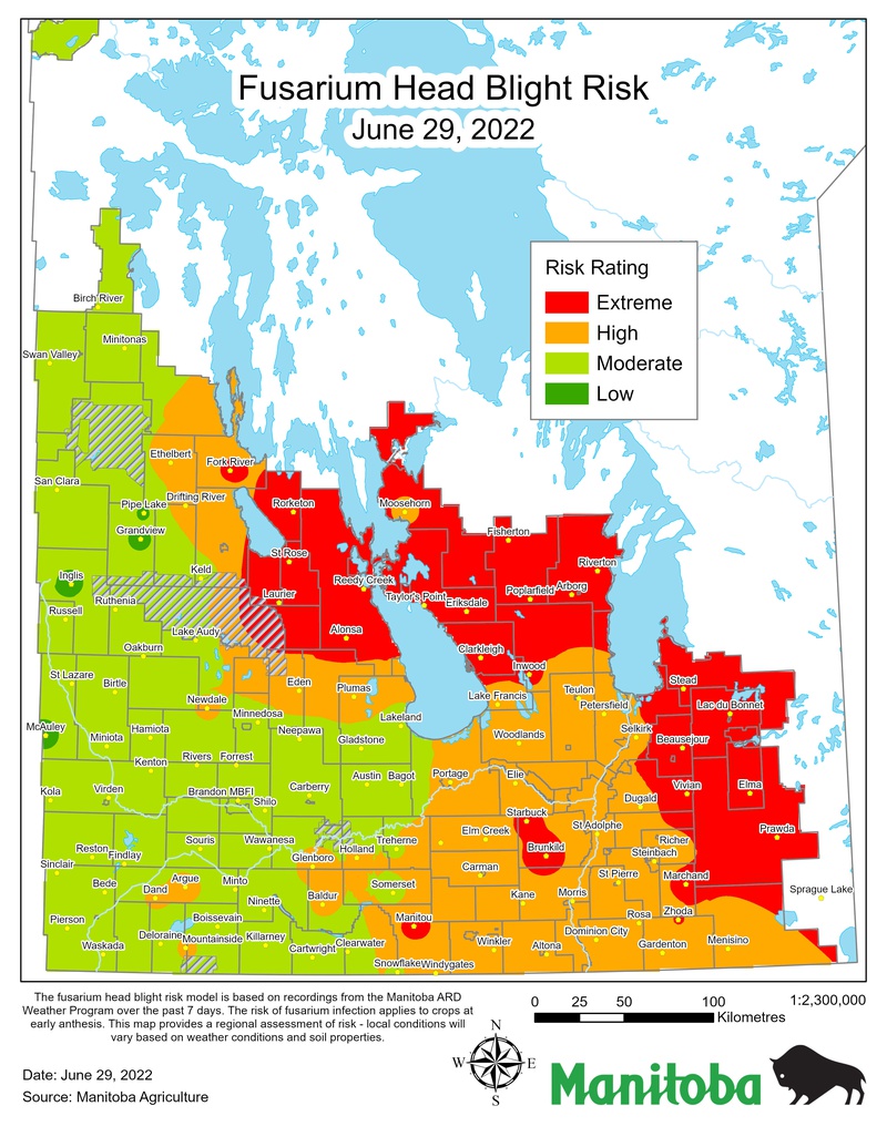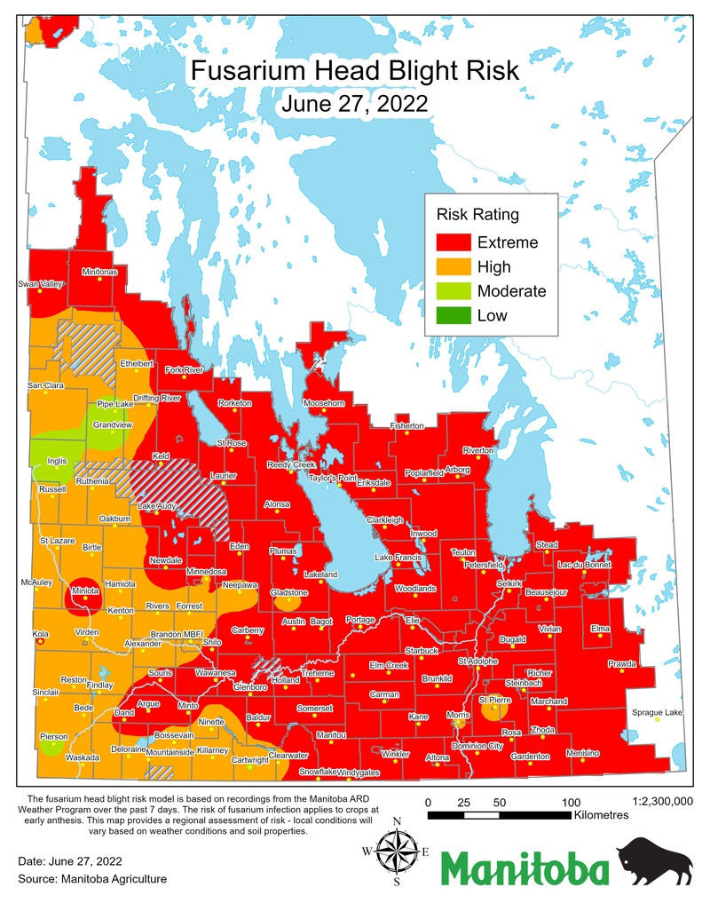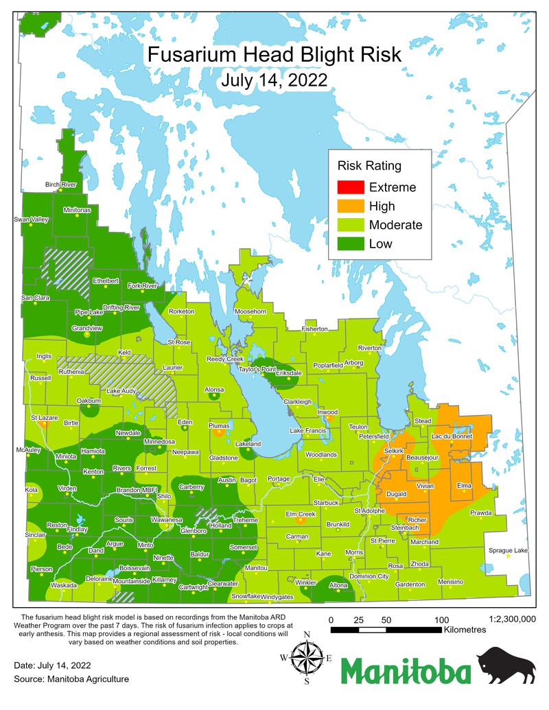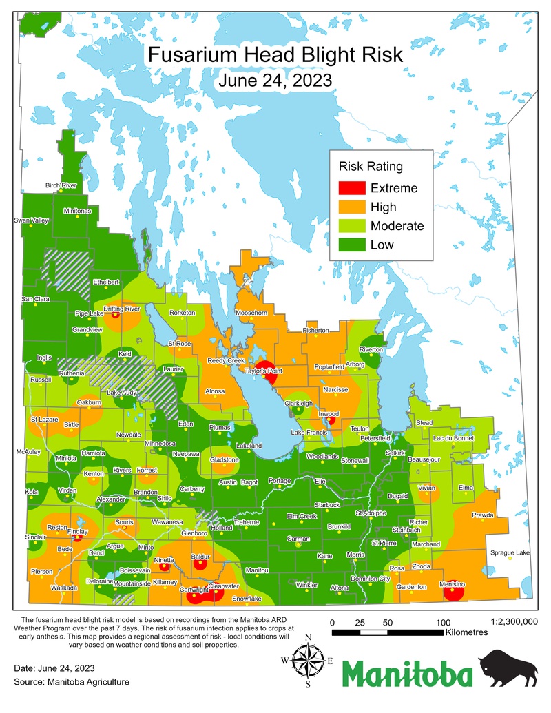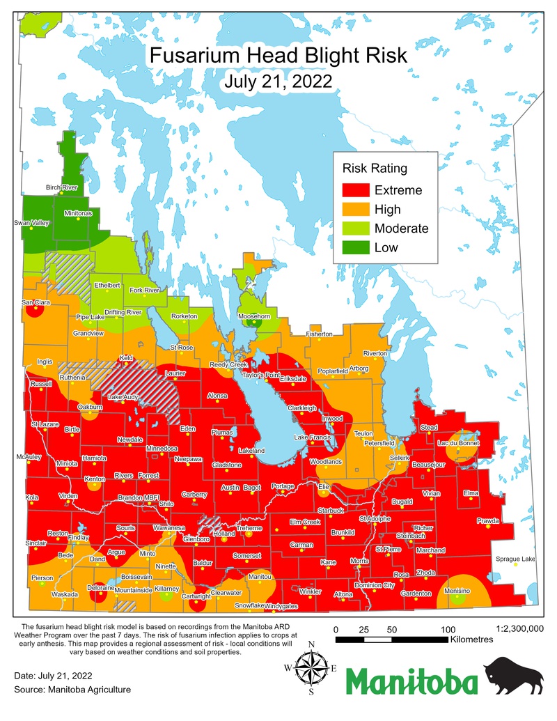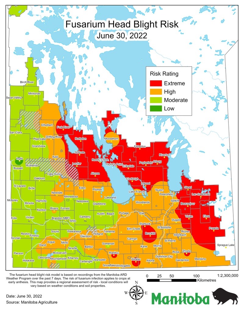 The Fusarium Head Blight Risk maps are posted daily, from the beginning of winter wheat flowering until the end of the flowering period for spring wheat. The maps from 2022 show the risk for the development of Fusarium head blight for the date indicated based on the previous seven days of temperature and precipitation. The maps from 2023 show the risk for the development of Fusarium head blight for the date indicated based on the previous 14 days of temperature and relative humidity. Warm, humid conditions occurring when the crop is susceptible to infection (during flowering) favour the development of this disease.
