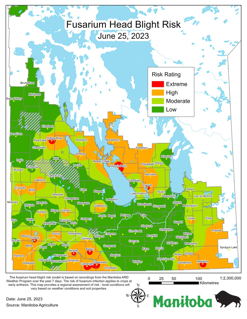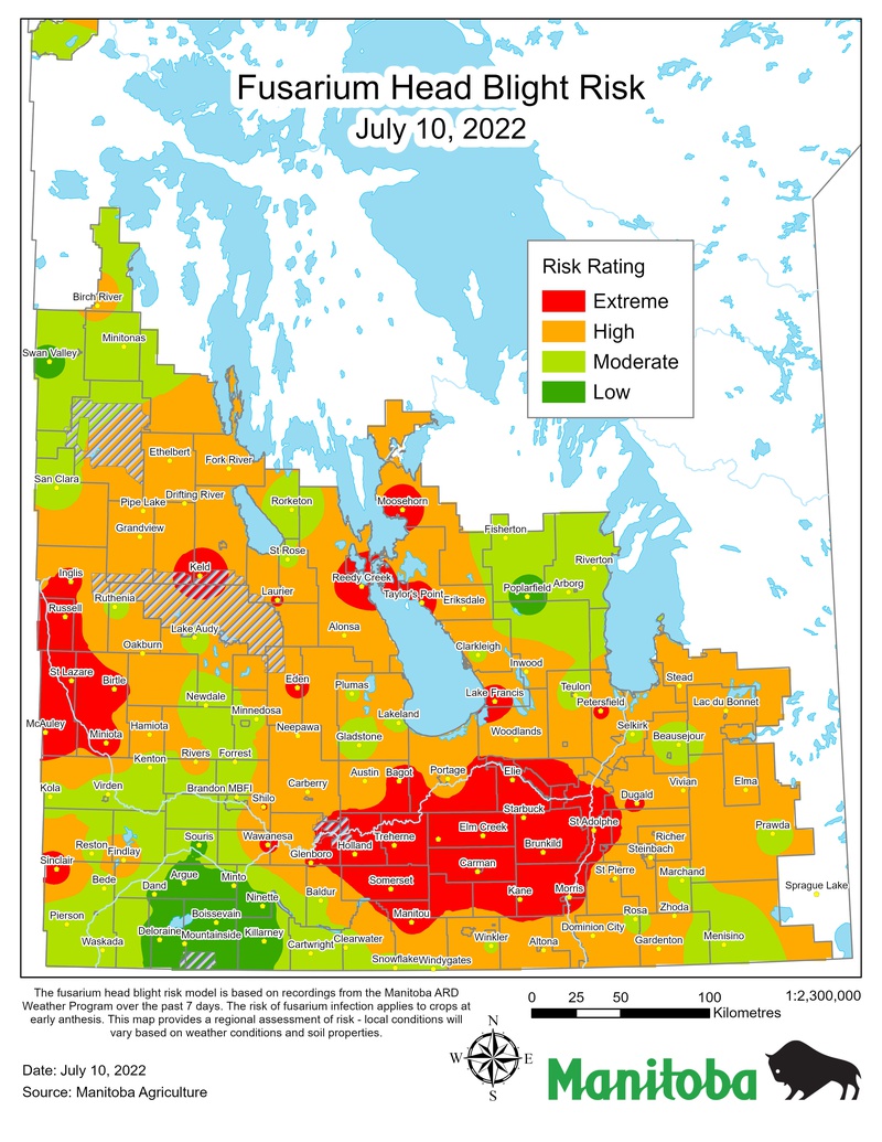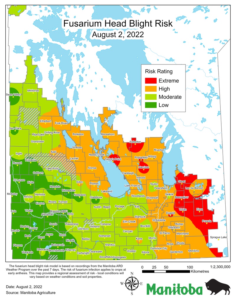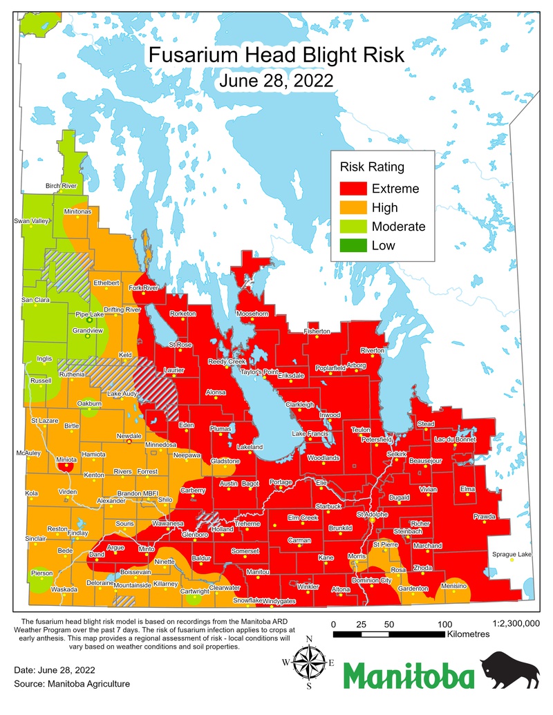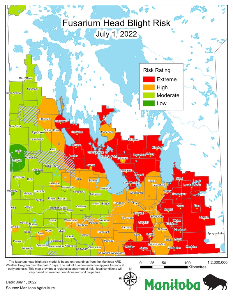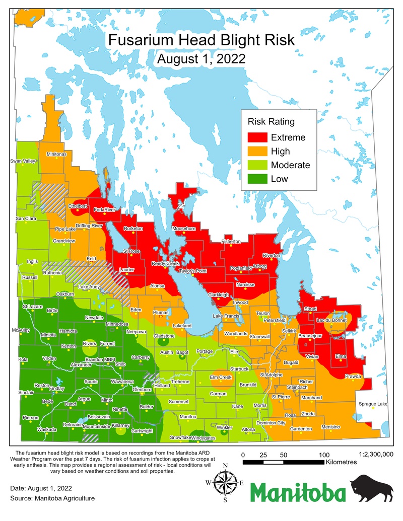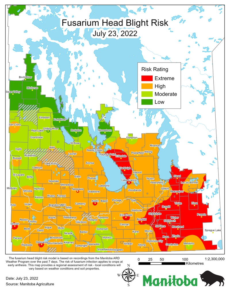 The Fusarium Head Blight Risk maps are posted daily, from the beginning of winter wheat flowering until the end of the flowering period for spring wheat. The maps from 2022 show the risk for the development of Fusarium head blight for the date indicated based on the previous seven days of temperature and precipitation. The maps from 2023 show the risk for the development of Fusarium head blight for the date indicated based on the previous 14 days of temperature and relative humidity. Warm, humid conditions occurring when the crop is susceptible to infection (during flowering) favour the development of this disease.