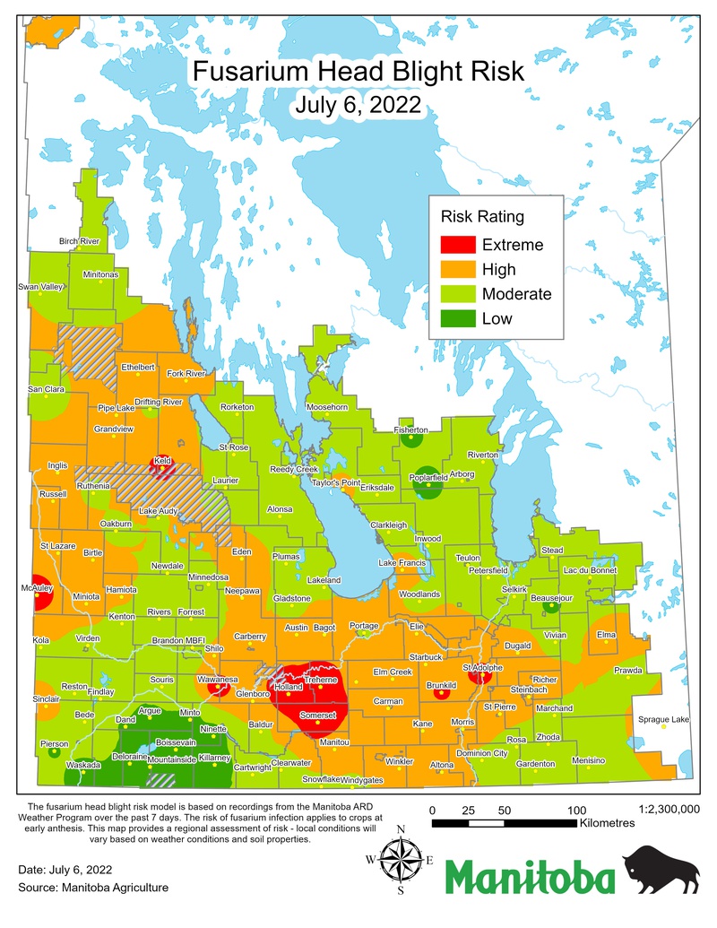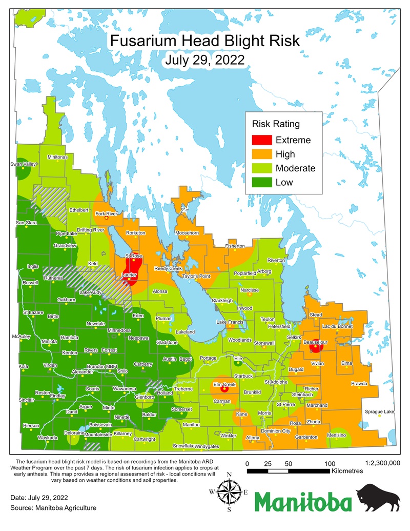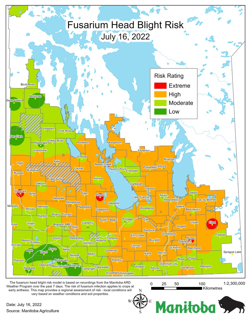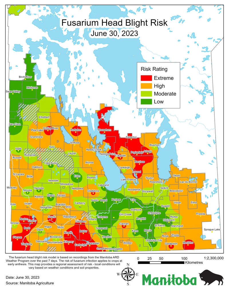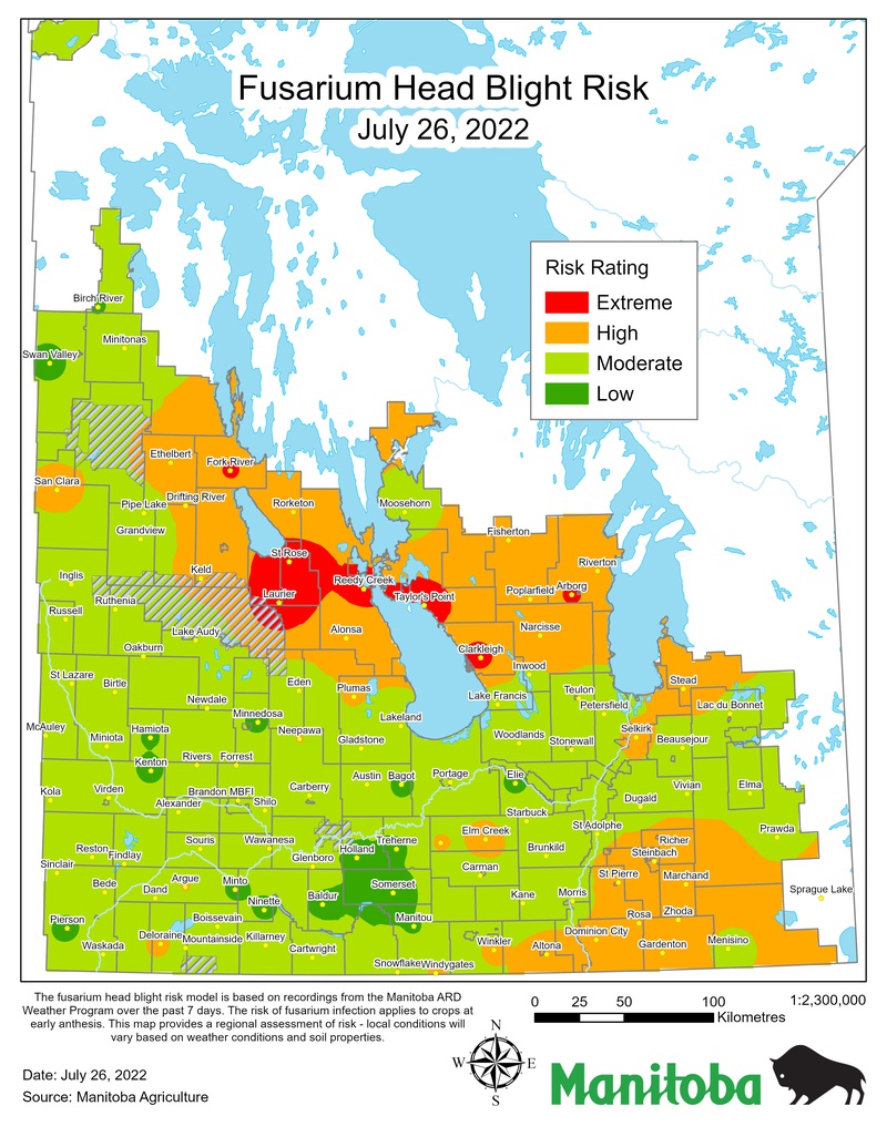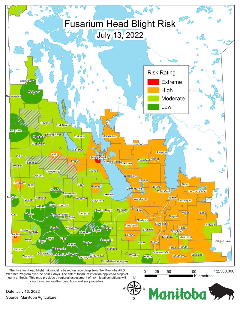 The Fusarium Head Blight Risk maps are posted daily, from the beginning of winter wheat flowering until the end of the flowering period for spring wheat. The maps from 2022 show the risk for the development of Fusarium head blight for the date indicated based on the previous seven days of temperature and precipitation. The maps from 2023 show the risk for the development of Fusarium head blight for the date indicated based on the previous 14 days of temperature and relative humidity. Warm, humid conditions occurring when the crop is susceptible to infection (during flowering) favour the development of this disease.