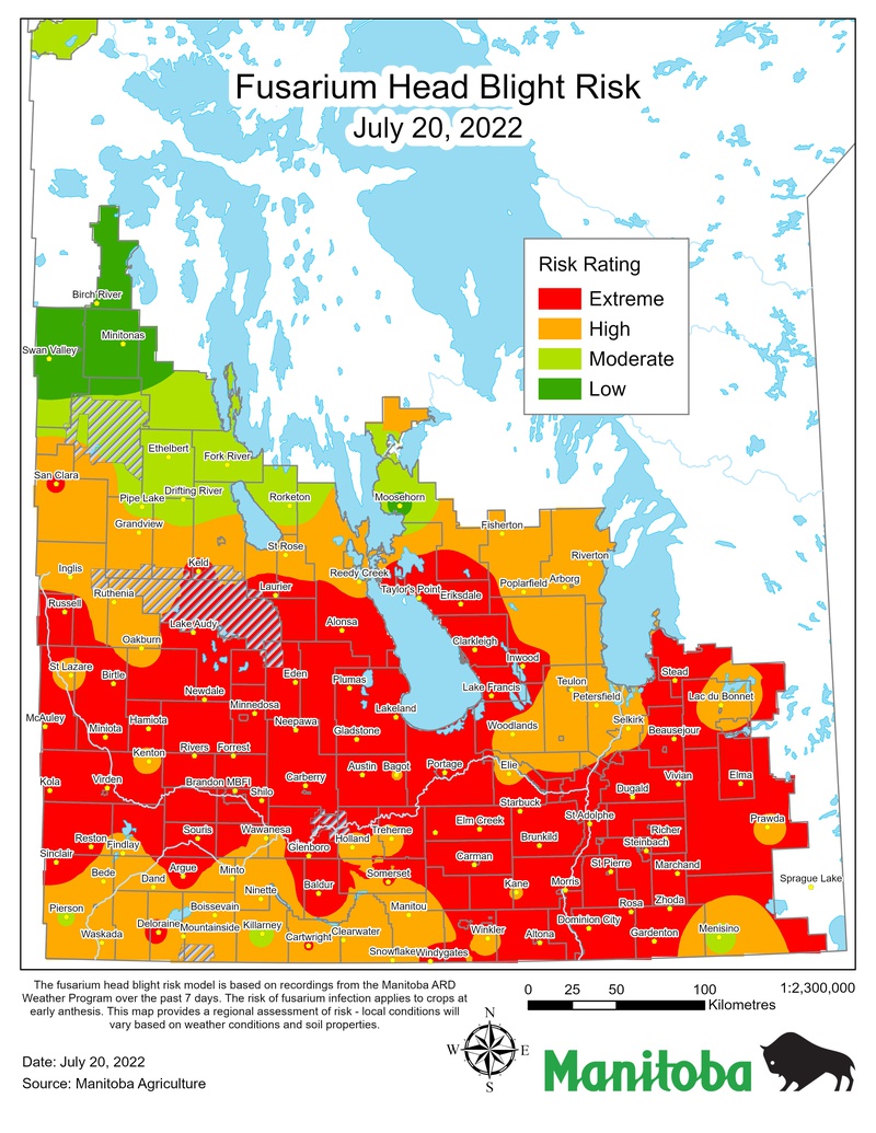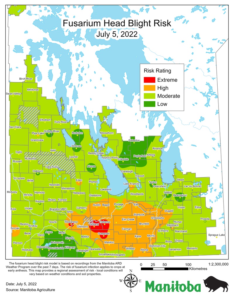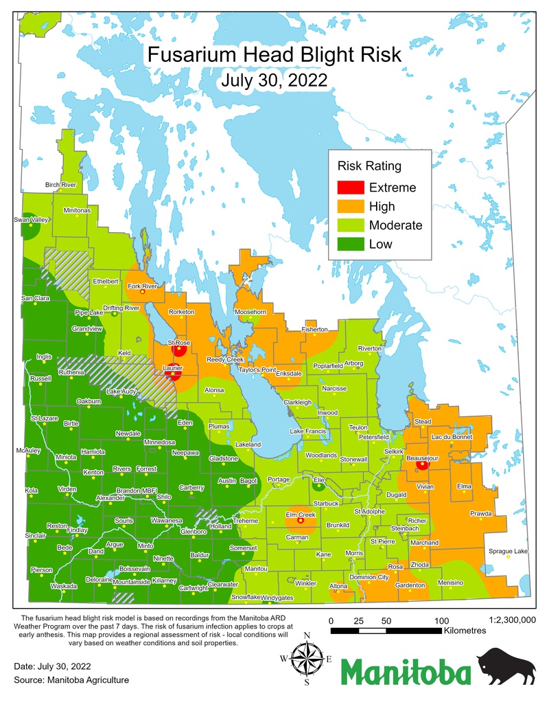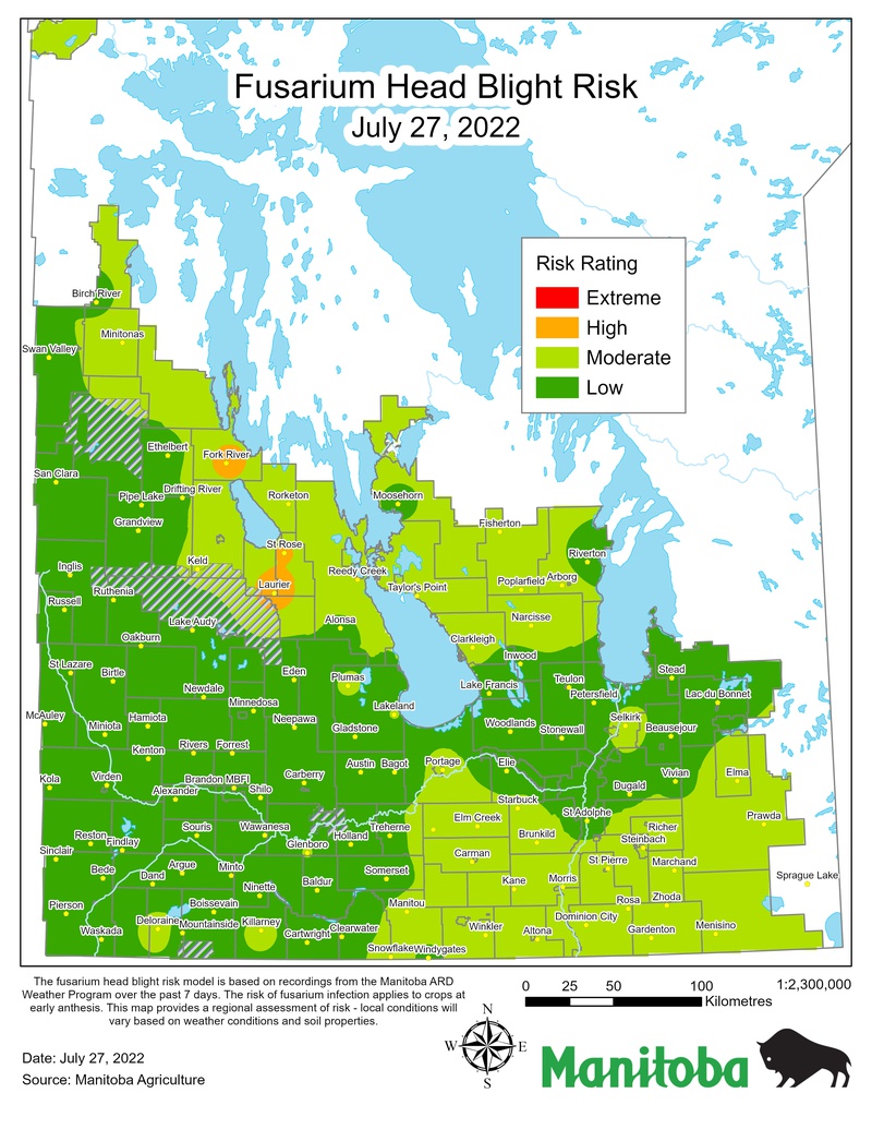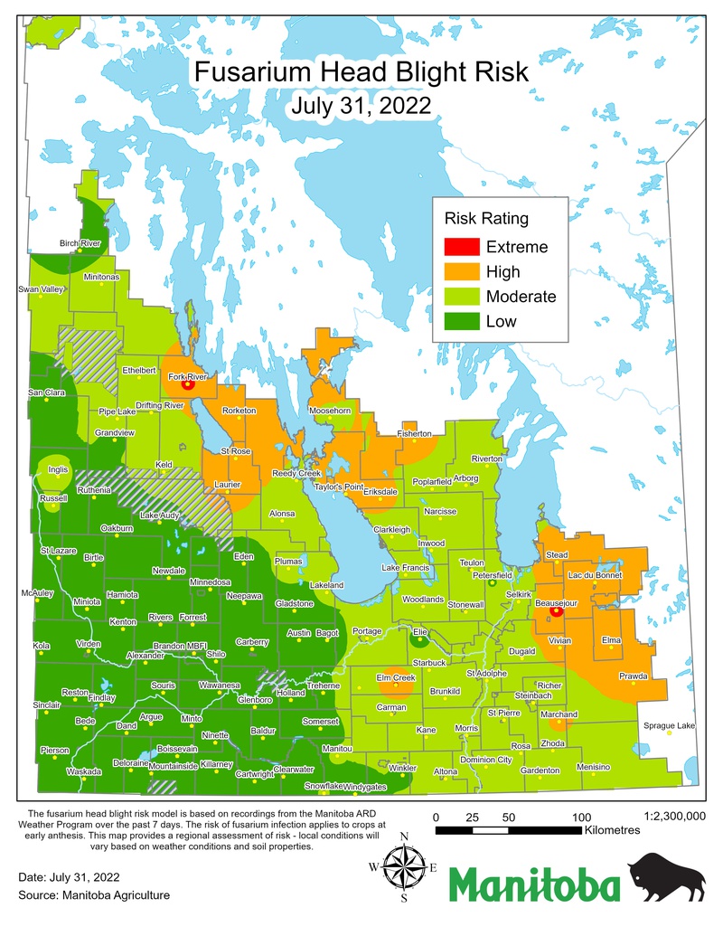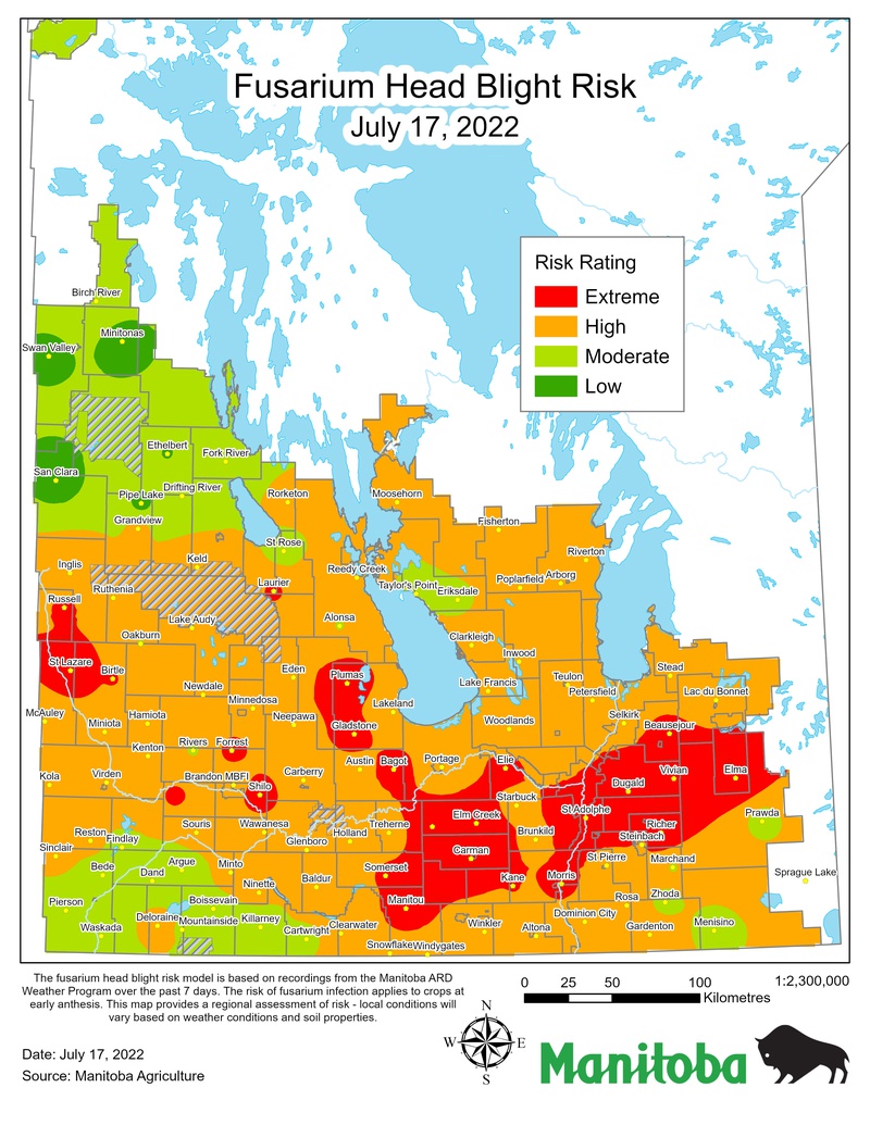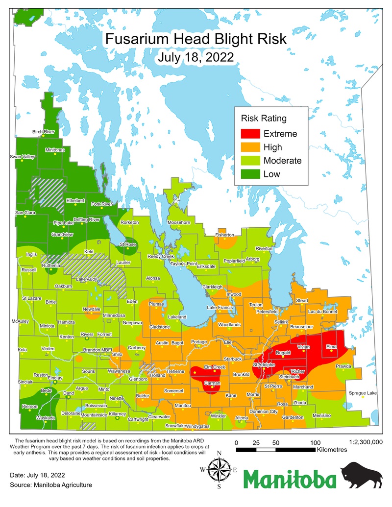 The Fusarium Head Blight Risk maps are posted daily, from the beginning of winter wheat flowering until the end of the flowering period for spring wheat. The maps from 2022 show the risk for the development of Fusarium head blight for the date indicated based on the previous seven days of temperature and precipitation. The maps from 2023 show the risk for the development of Fusarium head blight for the date indicated based on the previous 14 days of temperature and relative humidity. Warm, humid conditions occurring when the crop is susceptible to infection (during flowering) favour the development of this disease.