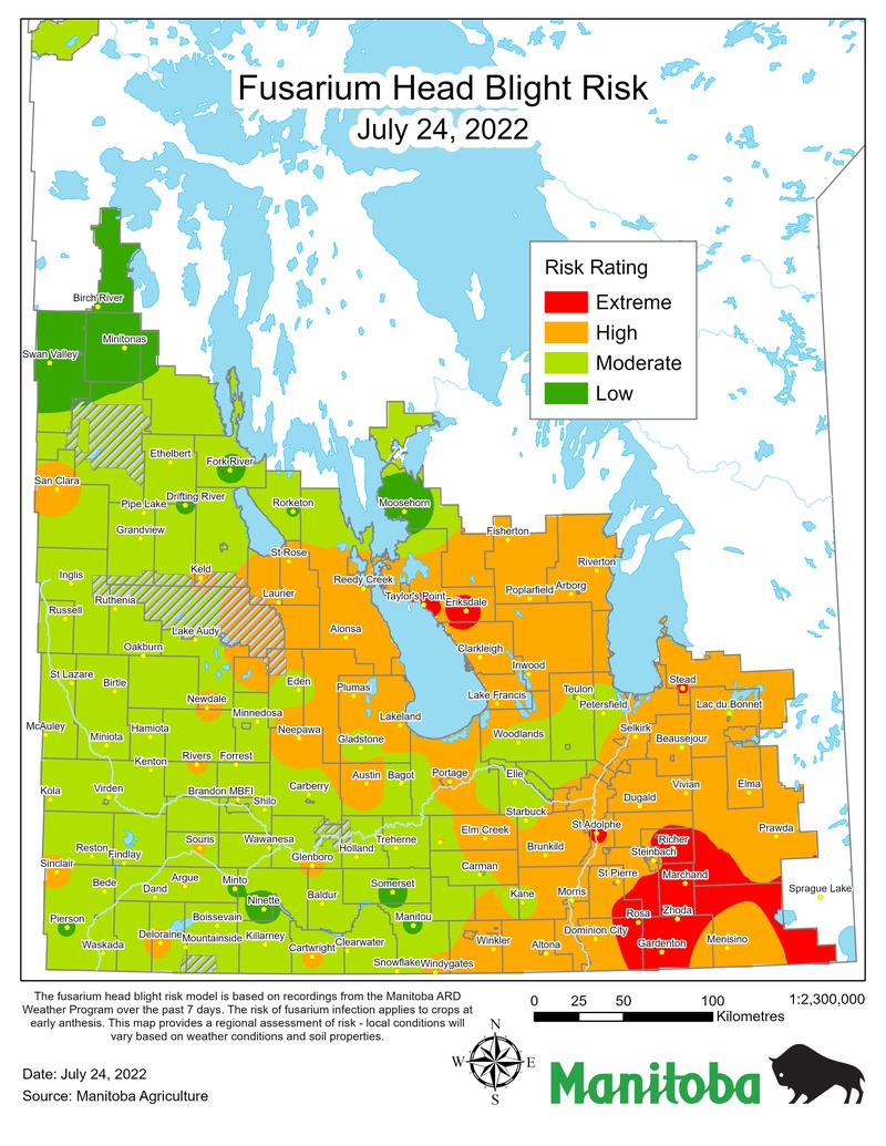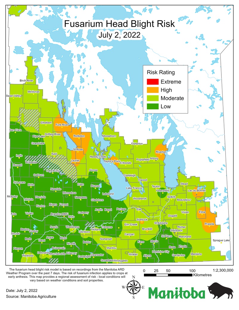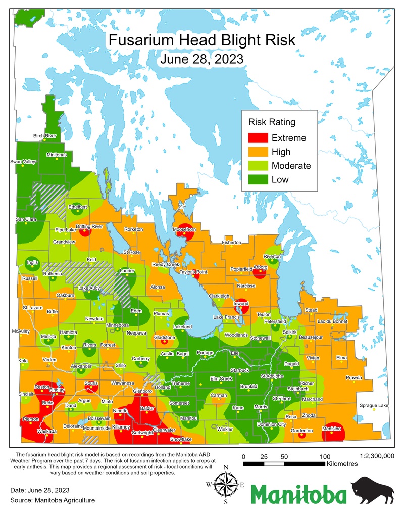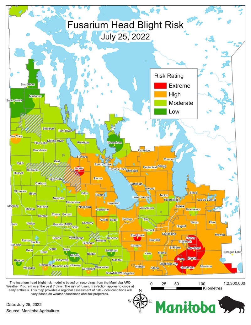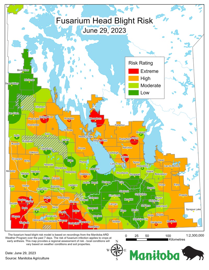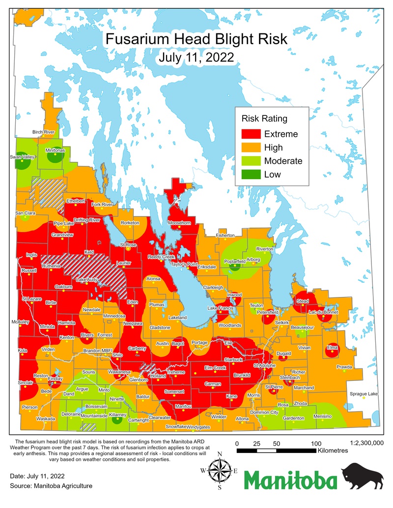 The Fusarium Head Blight Risk maps are posted daily, from the beginning of winter wheat flowering until the end of the flowering period for spring wheat. The maps from 2022 show the risk for the development of Fusarium head blight for the date indicated based on the previous seven days of temperature and precipitation. The maps from 2023 show the risk for the development of Fusarium head blight for the date indicated based on the previous 14 days of temperature and relative humidity. Warm, humid conditions occurring when the crop is susceptible to infection (during flowering) favour the development of this disease.
