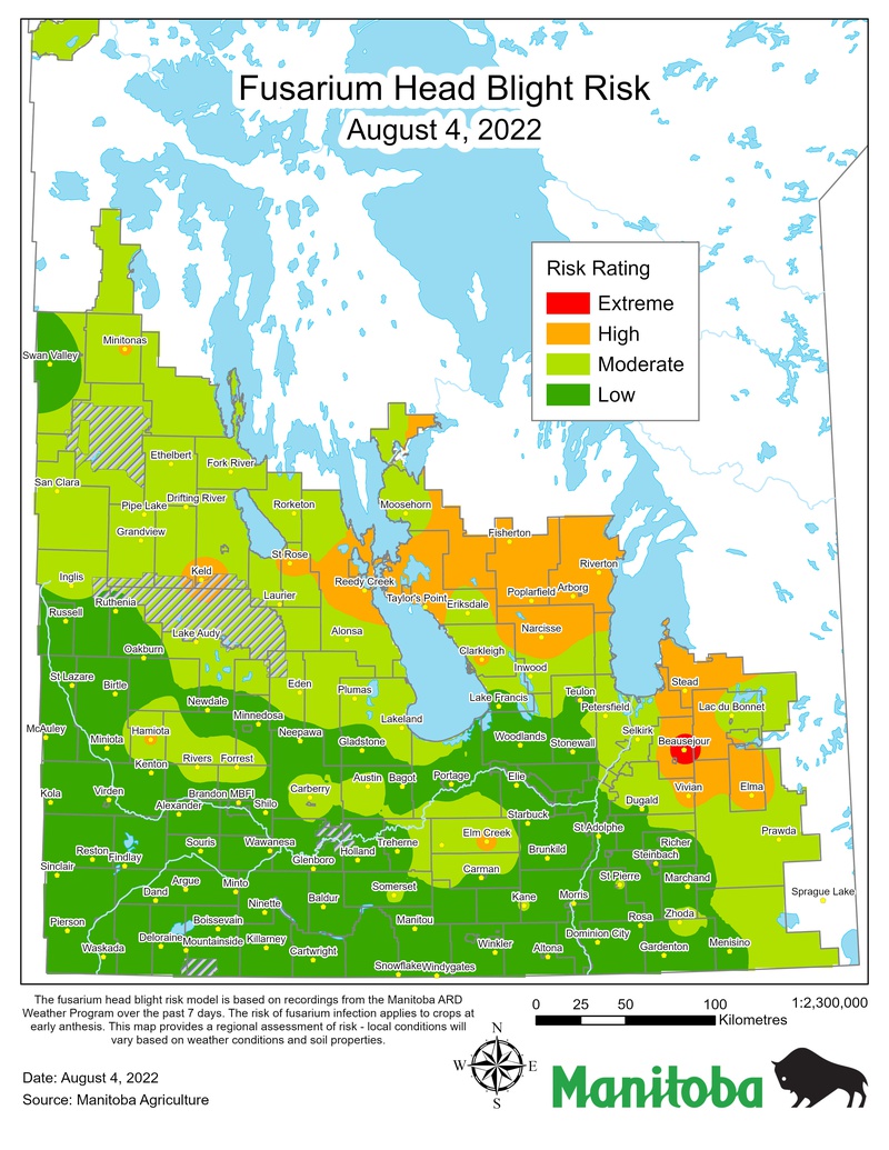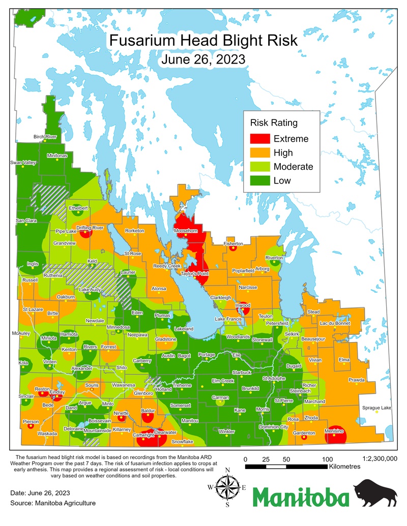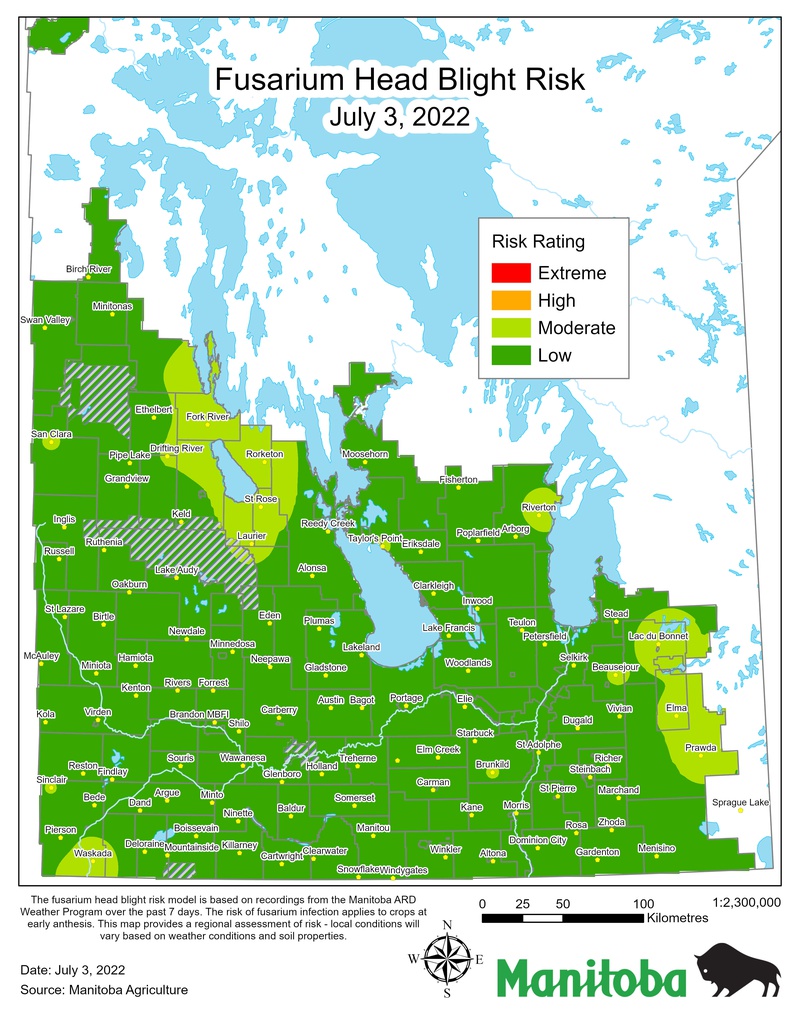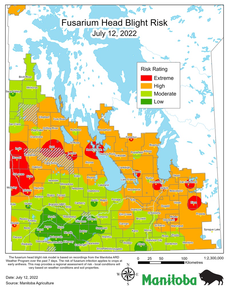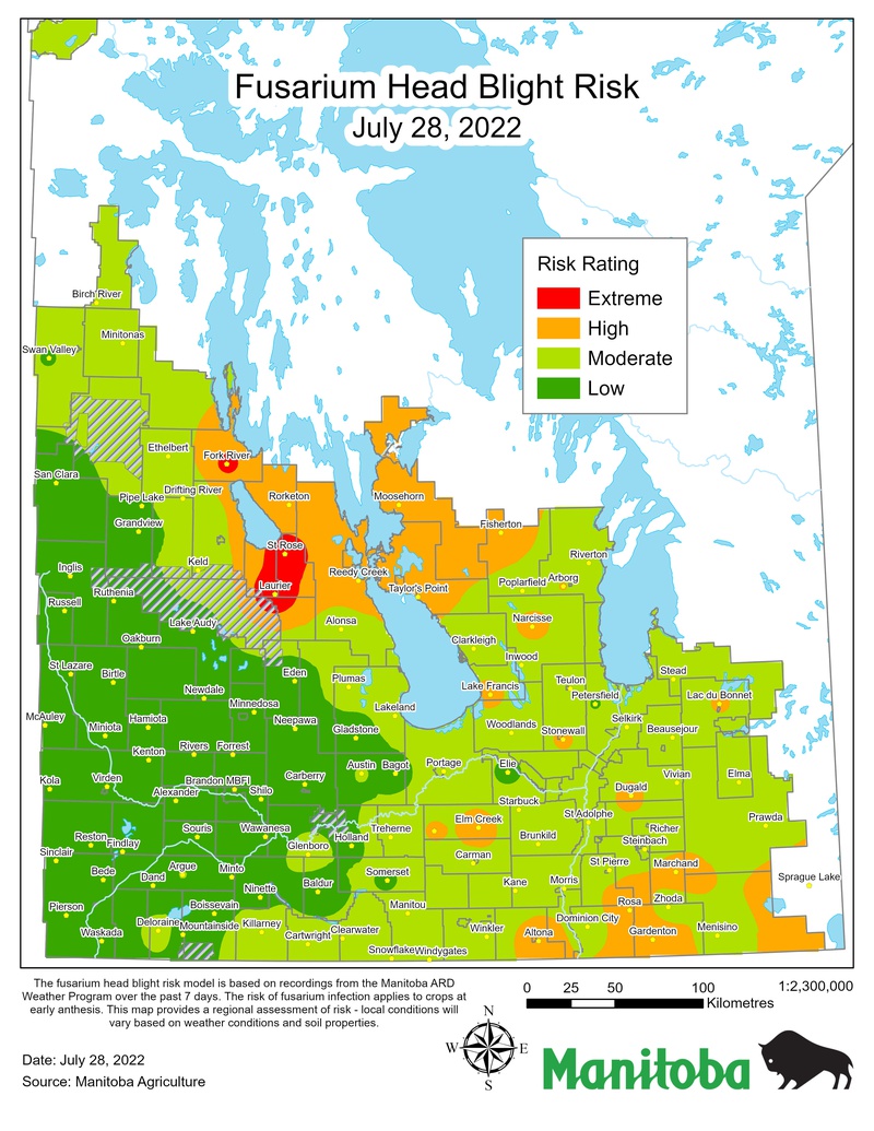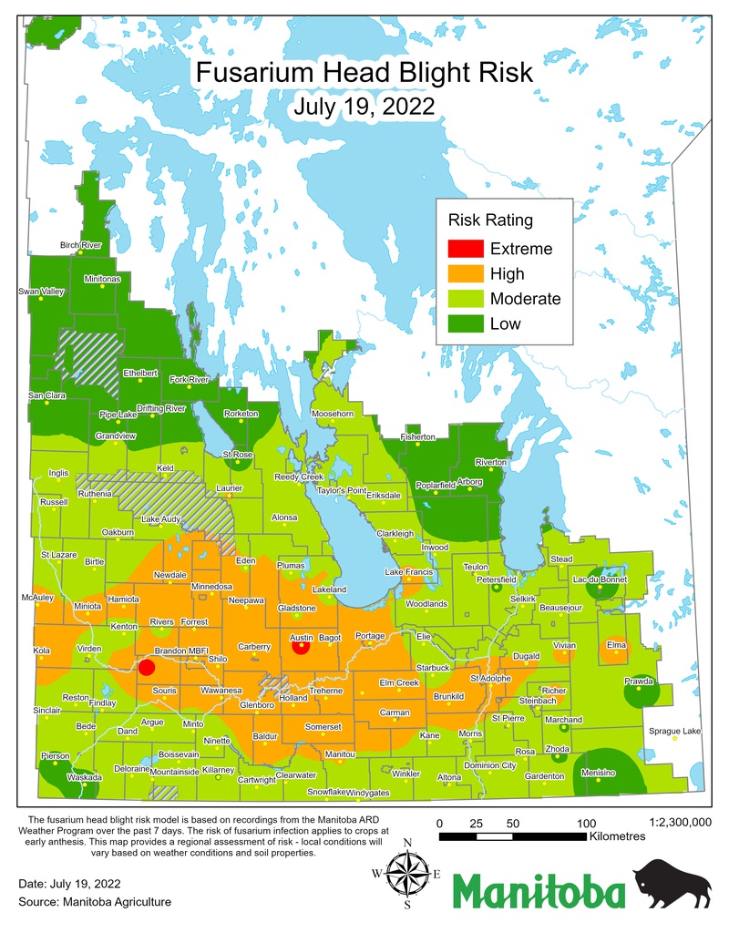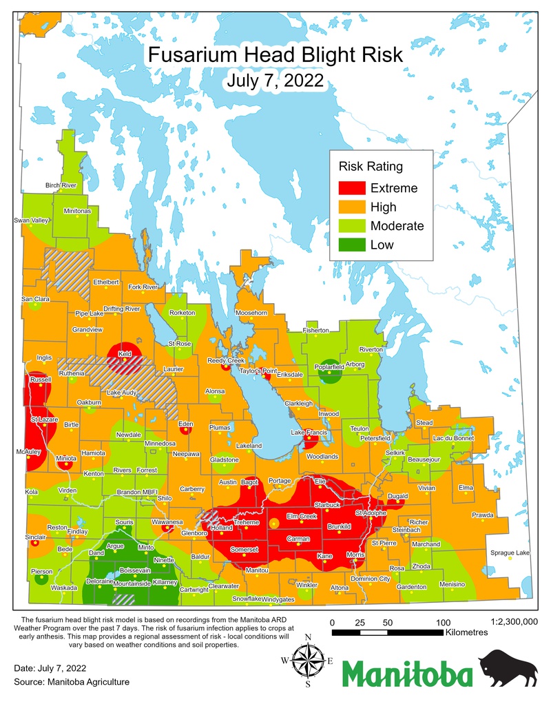 The Fusarium Head Blight Risk maps are posted daily, from the beginning of winter wheat flowering until the end of the flowering period for spring wheat. The maps from 2022 show the risk for the development of Fusarium head blight for the date indicated based on the previous seven days of temperature and precipitation. The maps from 2023 show the risk for the development of Fusarium head blight for the date indicated based on the previous 14 days of temperature and relative humidity. Warm, humid conditions occurring when the crop is susceptible to infection (during flowering) favour the development of this disease.