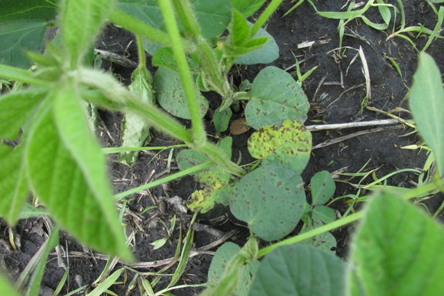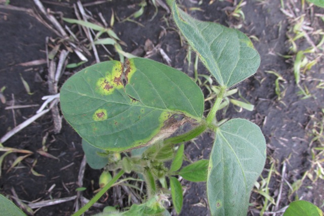 Brown spot disease (Septoria) is being observed in V3-V5 soybean plants in a few fields (Fig 1). With plenty of rains in the last few days, with thunderstorms in some areas, early spots of bacterial leaf blight (Fig 2) is also being seen, mostly on the upper foliage.