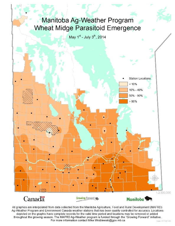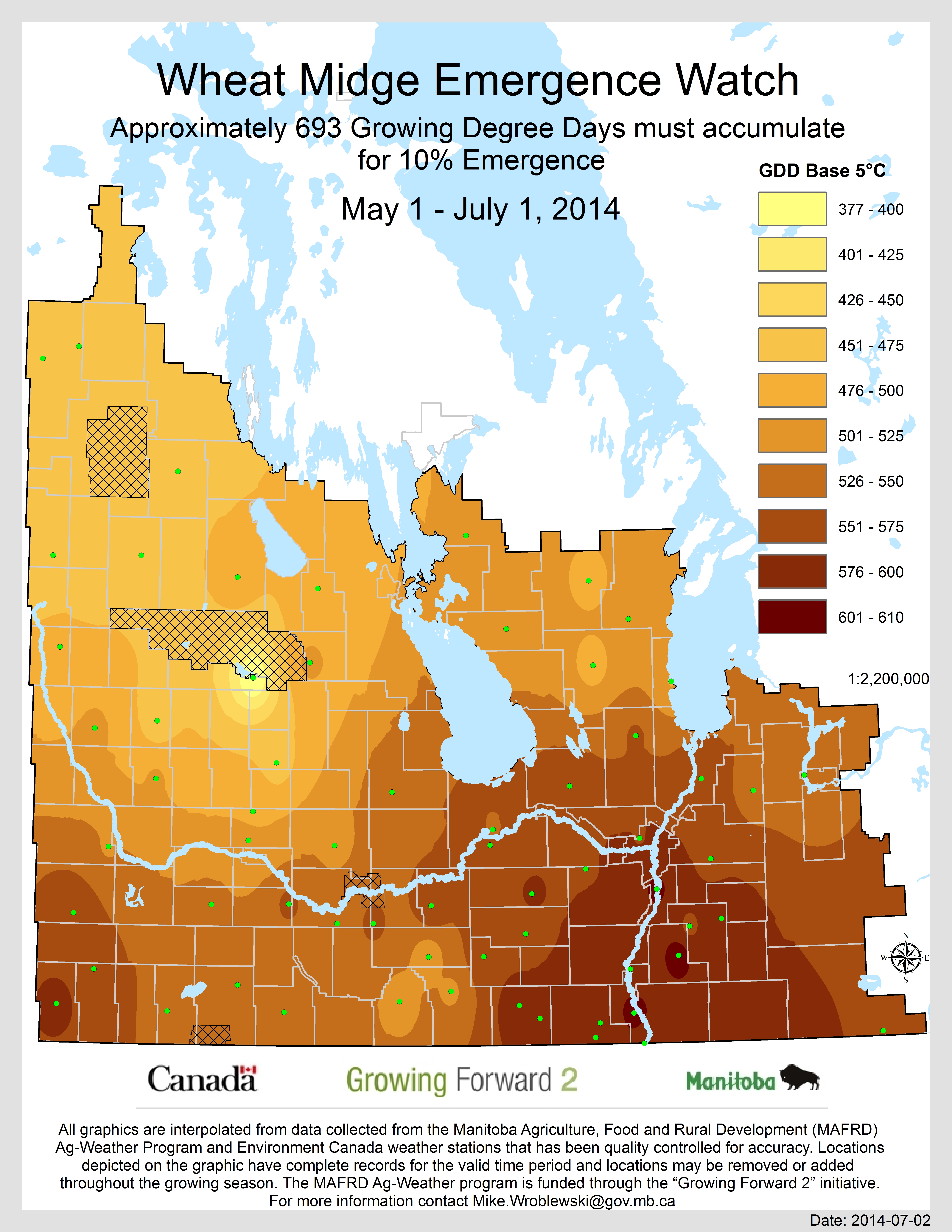 The emergence of adult wheat midge can be estimated using degree-day calculations, although rainfall in May and June can affect the accuracy of these calculations. With a 5 °C base temperature, accumulated degree-days (DD) for 10%, 50% and 90% emergence of wheat midge average 693 DD, 784 DD and 874 DD, respectively. Emergence can be 2–8 days later than expected at sites receiving more than 145 mm rain in May and June (Elliott et al. 2009. Crop Protection. 588-594). As the map below demonstrates, emergence of wheat midge is not likely to have begun yet. Further delays may occur because of excess rain in many areas.