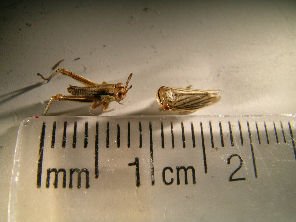Some non-economical species of leafhoppers may be present in the ditches this time of year. These are not species that can spread aster yellows, and are not a threat to crops. Be careful not to confuse them with grasshoppers. The photo below is of a small grasshopper (left) and one of the non-economical species of leafhoppers (right).