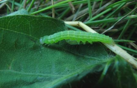 The photo below shows a green cloverworm. Note that they have 3 pairs of prolegs in the middle of the abdomen, and 1 pair at the end of the abdomen. They will also wiggle rapidly when disturbed. There may be other green caterpillars that can occasionally occur on soybeans, so you can use these features to help distinguish them from some of these other caterpillars.