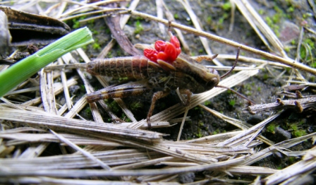 Question: A couple of people have commented on or sent photos of grasshoppers with red "egg-shaped" objects quite visible on their back, as seen in the photo below. What mite these red things be on the back of the grasshopper? Note - there is a hint in the way my question is posed.