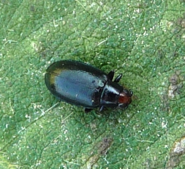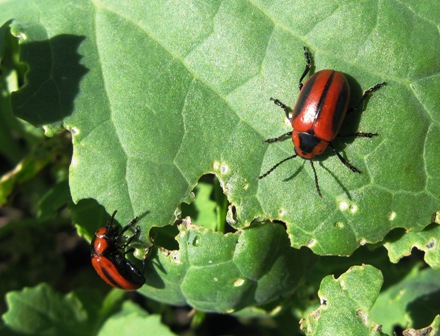 Redheaded flea beetles on corn and soybeans: Some have been noting some flea beetles, generally at low levels, on corn and soybeans. This is the redheaded flea beetle (Systena frontalis). They are slightly larger than the flea beetles you are use to seeing on canola, and just one of the 72 species of flea beetles known from Manitoba. They have a broad host range and should not be of economic concern on these crops. Some of their preferred hosts include ragweed, pigweed, lamb's-quarters, and smartweed. Adults are often gregarious, so there may be groups of them on certain plants, while nearby plants are often free of them. Note the red on the head of the flea beetle in the photo below. You may have to use magnification to see this on specimens from the field.