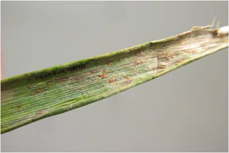 Leaf rust was observed in fall rye plants in western Manitoba. The disease is wind borne, and conditions of high humidity and warm temperatures could support dispersal and infection of other fields.