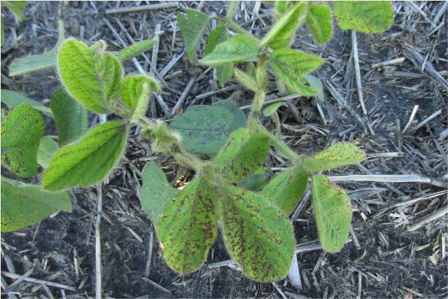 Brown spot disease (Septoria) continues to be seen in many more fields. Sometimes fomesafen (Reflex) herbicide injury appears similar to brown spot; but is present only on upper leaves, unlike brown spot which is currently appearing mostly on the lower leaves. The herbicide is contact type, and will show injury only on those leaves present; the leaves emerging later will not show spotting.
