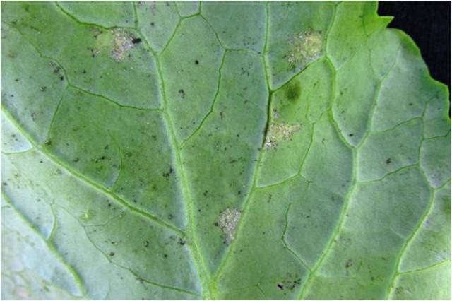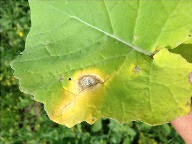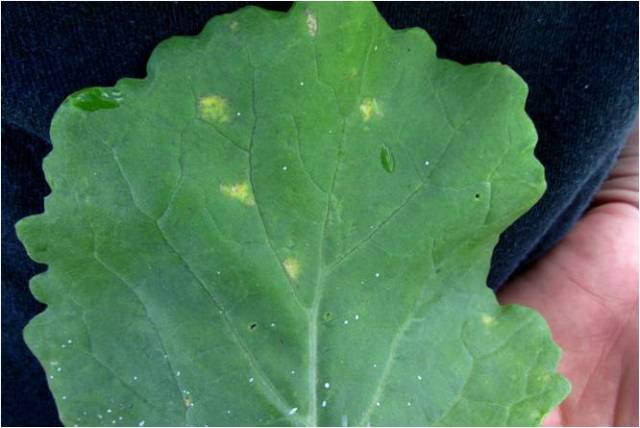 Fig.5. Downy mildew spots on canola leaf- upperside and same spot on underside, 2014. Photos courtesy: Vikram Bisht, MAFRD
