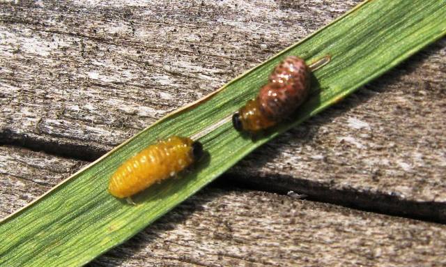 Note that larvae of cereal leaf beetle may look yellow, or have an oily appearance, depending on whether their coating (composes partially of their feces) is present or has been removed (through a moult or the larva being disturbed).