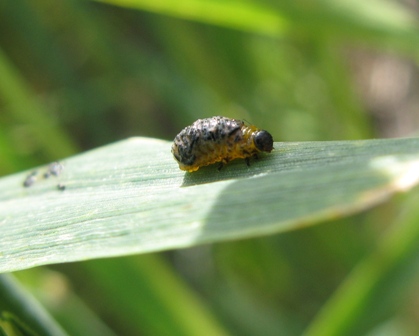 Cereal Leaf Beetles Needed: Low levels of cereal leaf beetle have also been found in some fields. A parasitic wasp called Tetrastichus julis, which is specific to cereal leaf beetle, has been released in Manitoba in the past few years. It seems to be establishing well, and hopefully will keep populations at sub-economic levels. We are hoping to once again collect cereal leaf beetle larvae and determine the percent of larvae that are parasitized from fields in various regions. So if you are noticing any cereal leaf beetle larvae on wheat, oats, barley, or any other cereal crop, please collect a sample or let me know so we can collect some and determine the level of parasitism in the population. Areas that may have low levels of parasitism would be considered for possible future releases of the parasitoid. Ideally a sample of at least 30 larvae is good for estimating percent parasitism. They can be collected off the plant or in a sweep net. Place some food for them in the container as well. The larvae often have a fecal coating over them, and may look like a drop of oil on the plant.