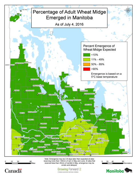 The following map shows the percent of wheat midge that are expected to have emerged, based on models using degree days to calculate percent emergence. Wheat midge emergence has started in Manitoba. In many areas it may only be about 10% or less of the wheat midge that have emerged (green on the map). Some areas of Central and Southwest Manitoba may have closer to 50% emergence (yellow on the map).