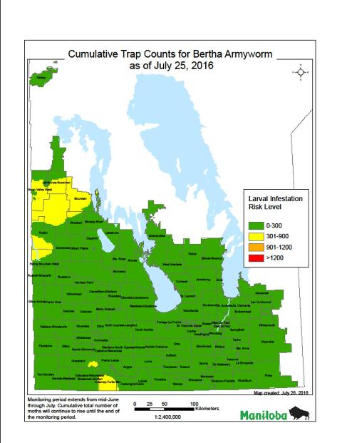Bertha armyworm: Cumulative trap counts for bertha armyworm are mainly in the low risk range (less than 300). Out of 83 traps, 72 are in the low risk range, 10 are in the uncertain risk range (300 to 900 moths), and 1 traps is in the moderate risk (900 - 1,200 moths). No traps are in the high risk range (1,200 plus moths). Most of the counts above the low risk range are in the western regions of Manitoba. The table below shows the highest counts as of July 26: