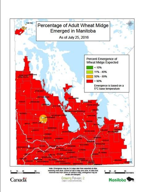 A lot of wheat fields in Manitoba would have not been susceptible to wheat midge (having already flowered) by the time high levels of wheat midge had emerged. By now, all but the latest seeded fields would likely be too advanced for wheat midge to be a concern.
