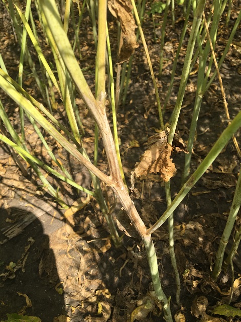 Blackleg symptoms are easiest to identify when stems are cut at the base. The perfect time to scout is at harvest, so bring your clippers along and jump off the swather or combine from time to time.