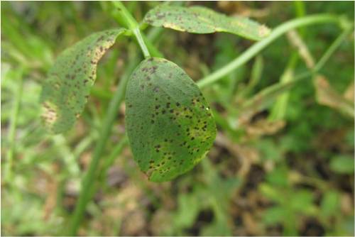 Severe leaf spotting of alfalfa was observed at the University of Manitoba Carman Research Farm (Fig 1). Cool temperatures and frequent spring rains are favorable for the development of foliar diseases. High levels of the diseases can cause early defoliation.