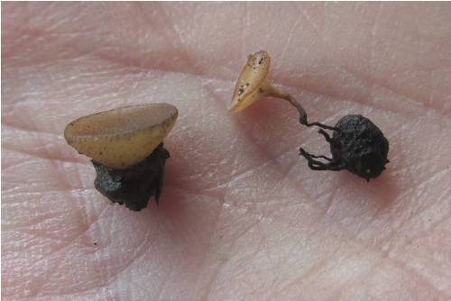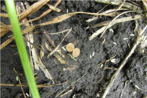 Fig.3. Apothecia on wet soil in thick wheat canopy. Fig.4. Germinating Sclerotia in wheat canopy, found Photo: Vikram Bisht, MAFRD. by David Kaminski. 2014.