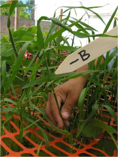 Fig 12, Flag leaf curling in wheat field. Fig. 13.Boron deficiency developed using hydroponics NFT technique, shows flag leaf curling – Vikram Bisht, MAFRD, 2010 Crops Diagnostic School.