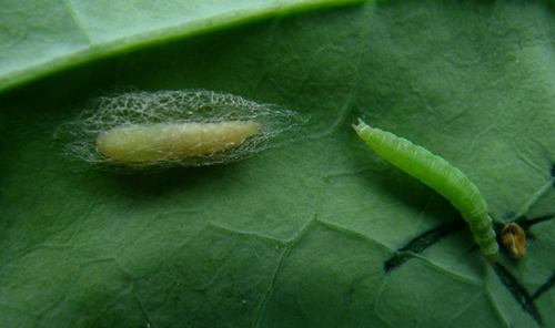 Fig. 5. Diamondback moth pupa (left) and larva (right).