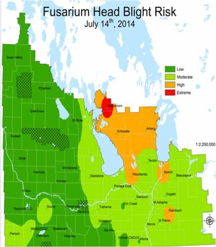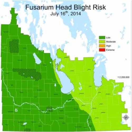 The FHB risk forecast for the whole province has been low to moderate for a few days around July 11; but after rains in the weekend the risk increased again (12 -14 July) especially in the eastern half of the province; near the lake region was high to extreme. The risk on Jul 16 is low in the western MB to moderate in eastern MB.