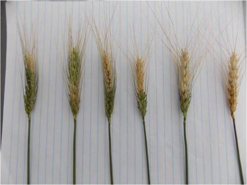 Fig 14. Winter wheat showing FHB, Winkler. Fig 15. Winter wheat heads showing FHB, Photo courtesy Tao Wang, CargillAgHorizons . from 15% to 100% spike infection.