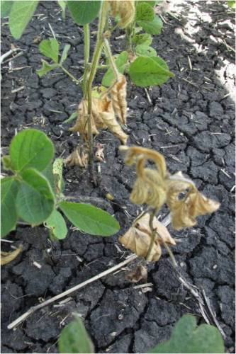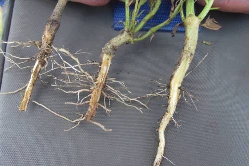 Phytophthora root rot has started appearing in a few fields (Fig 6, 7) especially those with excess moisture and standing water for a few days. Typical symptoms include drying plants with leaves still hanging on, and stems with dark brown discoloration from below the soil line.