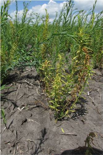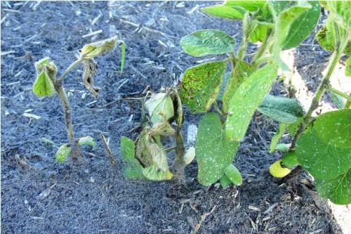 Fomesafen (Reflex) injury on foliage on plants on the right. leaves still hanging on – typical diagnostic