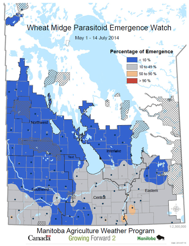 The following maps show the emergence of wheat midge and its key parasitoid Macroglenes penetrans. So far there have been no reports of high levels of wheat midge in Manitoba, and emergence may still be in the early stages in northern Manitoba and the northern Interlake.