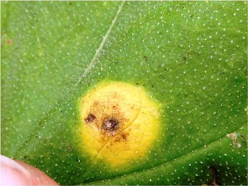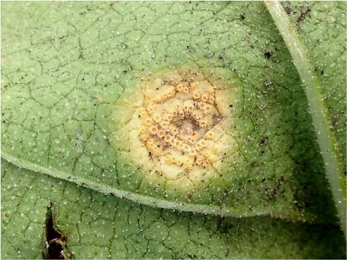 Fig 10, 11. The aecial cups seen on the underside of the sunflower leaf, and same spot on the upperside of the leaf. Photo Courtsey: Troy Turner, National Sunflower Association of Canada.
