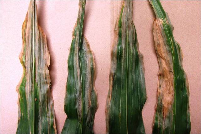 Fig.1. Corn leaf with well developed leaf blight of Goss’s Wilt disease. Photo: Vikram Bisht, MAFRD