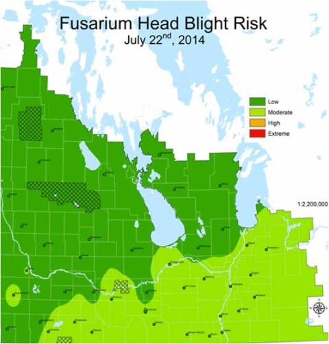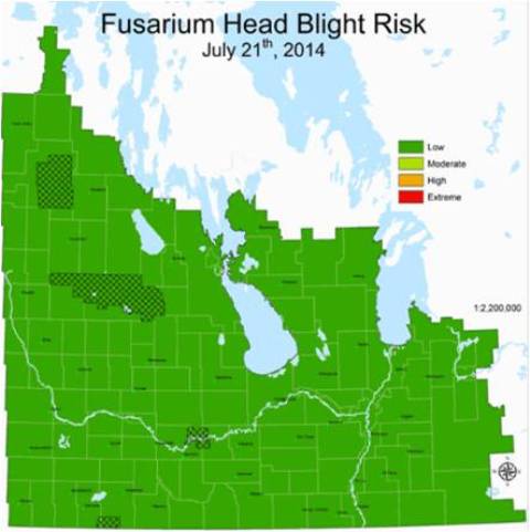 Fusarium head blight: The Fusarium head blight risk forecast for the whole province has been low on July 21 but changed to moderate in the southern half of the province on July 22 due to overnight rains. A lot of spring wheat fields have finished flowering and are in the milk stage.