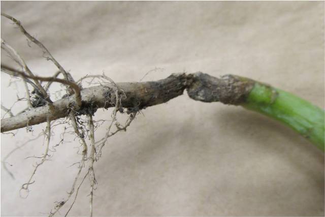Fig. 2 & 3. Girldling on canola root, accompanied often with blackleg pycnidia in the lesion. 2014. Photo: Vikram Bisht, MAFRD.