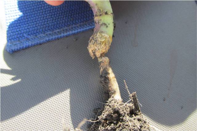 Pathogens: In many areas the canola crop is near the end of flowering. Fewer fields are at the early flowering stage. With the warm and moist canopy of densely growing crops there may still be some white mold inoculum within a crop and coming from outside. Flowering canola needs to be protected against white mold disease. Blackleg disease and what appears to be brown girdling root rot is being reported from a few fields (Fig 2 & 3). The diagnosis is being confirmed in the lab. The incidence appears to be high in tight canola rotations. Many of the plants also are showing root maggot damage. Lodging appears high in such fields.
