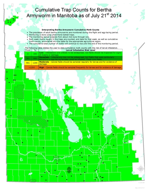 Bertha armyworm: A network of pheromone-baited traps has been monitoring the relative abundance of moths of bertha armyworms. What the traps catch are specifically the male moths. Although the traps can not predict individual fields that are at higher risk (it would be wrong to use the traps in this regard) the combined results can be used to predict regions that may be at higher risk. Consistently getting cumulative counts under 300 moths over the trapping period for traps in a region indicates a lower risk. So far the risk of bertha armyworm is low in Manitoba, as shown by the table and map below.
