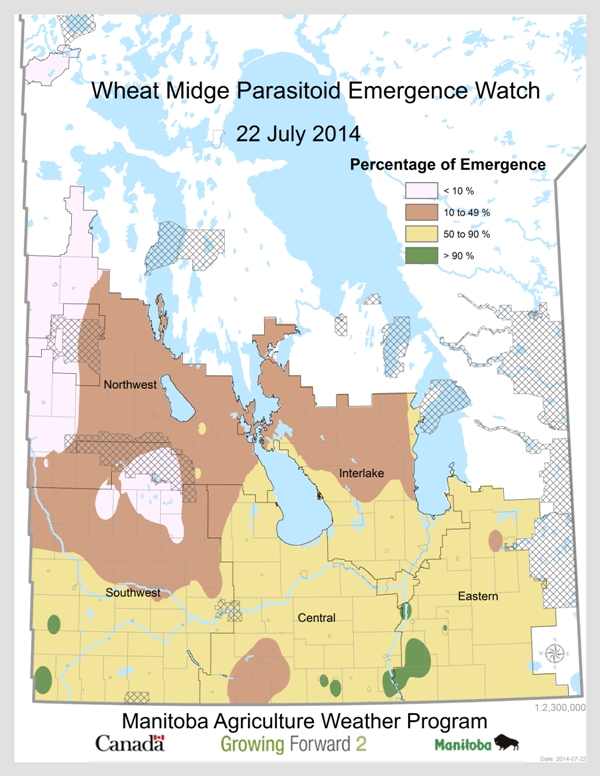 Wheat Midge: Emergence of wheat midge should now be 50% to 90% complete in many areas of southern Manitoba. Note the synchrony of the emergence of Macroglenes penetrans, the most important parasitoid of wheat midge, with that of wheat midge. Macroglenes penetrans wasps will also be emerging and looking for eggs of wheat midge to lay their eggs into.