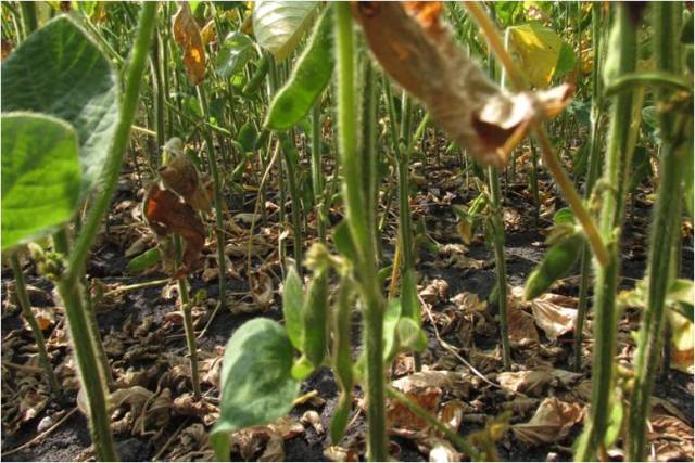 Fig. 4. Heat and brown spot causing defoliation on soybeans. Photo: Vikram Bisht, MAFRD.