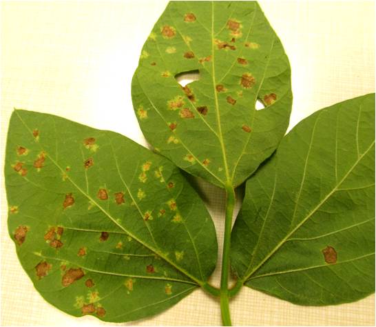 The diseases most commonly seen are brown spot, bacterial blight, downy mildew, and scattered plants of Phytophthora root rot (mostly 1-2%). In some fields, especially soybean following soybean, there is apparently a higher number of downy mildew leaf spots, many of which have matured into a brown color, but are still showing downy growth on the underside of the leaves (Fig 1a – 1c).