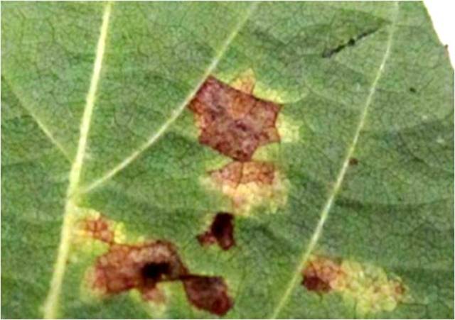 Fig. 1a. Typical lemon-yellow spots of downy mildew on soybean. Photo: Vikram Bisht, MAFRD.