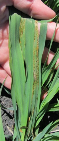 Stripe Rust: The first report of stripe rust in Manitoba has come in from a winter wheat field southwest of Killarney (Fig. 1). Stripe rust and cereal leaf rust were also observed at extremely low severity in the MCVET winter wheat plots in Carman. Previous reports from North Dakota indicated that this disease was present all the way up to the Canadian border. Many winter wheat fields in the province are reaching the early flowering stage which is the key timing for a fungicide application to manage Fusarium head blight. A fungicide at this timing will also help protect the flag leaf from leaf diseases such as stripe rust. Continue to scout both winter and spring cereal crops for rusts and report any finds to MAFRD so that the locations of these diseases can be shared with others.