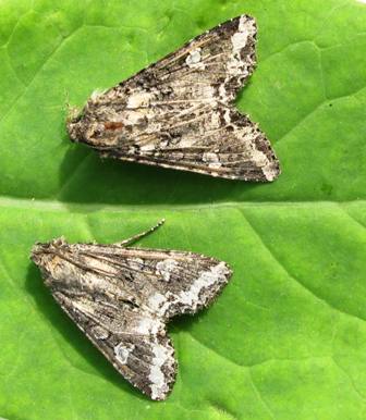 The photo below is of moths of bertha armyworm. Note that moths other than bertha armyworm sometimes do end up in the traps. Moths of bertha armyworm will have irregular transverse white markings near the tip of the forewings, and above these markings there are white, kidney-shaped markings towards the wing margins.