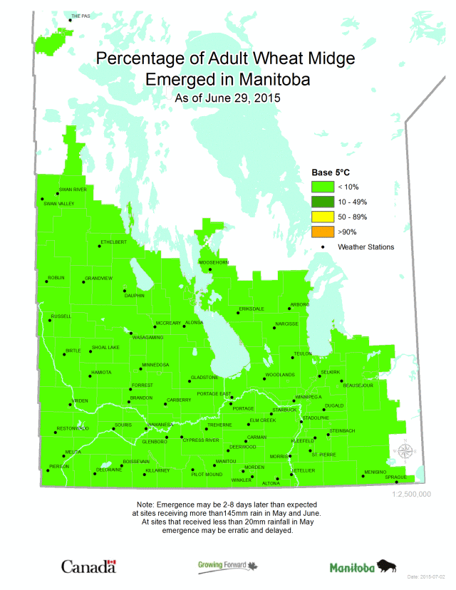 Wheat Midge Emergence: Emergence of wheat midge, based on degree-day models, is currently less than 10%. So most of the emergence is yet to come and will likely happen in the second and third week in July. So any wheat that is already producing anthers, or heading out and close to producing anthers, should be at low risk of wheat midge damage. After the wheat heads produce anthers the wheat kernels are no longer susceptible to feeding by wheat midge. Note from the maps below that although wheat midge emergence is still less than 10%, its key parasitoid, Macroglenes penetrans, is further ahead in its emergence, so populations will be ready for wheat midge when it emerges.