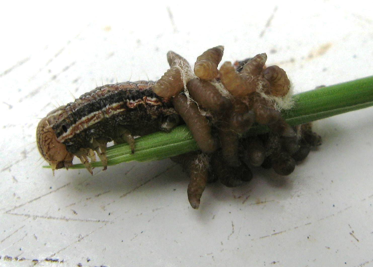 Fig. 2. Larvae of parasitic wasp emerging from armyworm. Fig. 3. Egg of parasitic fly on armyworm