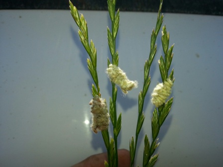 Are their parasitoids of armyworms present. Quite a few people over the past week have sent in photos (as in Figure 2 below) asking what are these "eggs" on the cereal heads, and noticing that they can be quite abundant in some fields. These are not eggs, but are the pupal cases of parasitic wasps. These are being found in fields that contained armyworms, and it is likely that armyworms were hosts for the parasitoids. For some parasitoids it is common for dozens of parasitoid larvae to emerge at the same time from an individual armyworm, killing it in the process. This is because an initial egg laid in the armyworm starts dividing and can become dozens or at times hundreds of eggs, that results in multiple parasitoid larvae of the same general age feeding in the armyworm. When the parasitoids emerge form the armyworm, they all emerge at approximately the same time, and very soon after form these clusters of pupal case, which are together in a cluster on the plants. So each cluster would have been parasitoids form a single armyworm, and will result in multiple wasps looking for more caterpillars to parasitize.